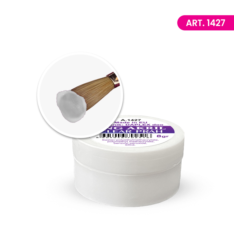 Akrilni prozirni prah za nadogradnju i izlivanje noktiju.  Lak za rad, srednje brzine stvrdnjavanja. Koristi se sa Extra nail liquid-om. Samo za profesionalnu upotrebu. Zemlja uvoza: Holandija, EU. Uvoznik: "Daplex" doo, Beograd