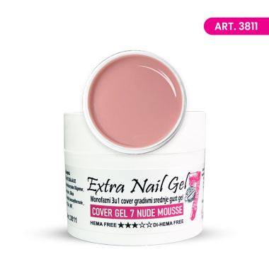 Cover Gel Nude Mousse 7 je profesionalni HEMA-free i Di -HEMA free gel sa visokom viskoznošću, idealan za izlivanje noktiju, pinčovanje i kreiranje prirodnog izgleda noktiju zahvaljujući svojoj neprozirnoj formuli. Dizajniran da pruži savršeno pokrivanje nepravilnosti na ploči nokta, ovaj gel je odlična podloga za French  i savršen je za izgradnju dugačkih noktiju. Količina 50ml.